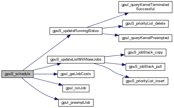 If the compiler switch S_NON_PREEMPTIVE is defined, this function schedules kernel non-preemptively, otherwise it schedules them in a limited preemptive manner. First this function updates the kernel's scheduling state and deletes completed kernels form gpuS_JobList_s, then it updates the job list gpuS_JobList_s with all new released kernels. After that, this function iterates through gpuS_JobList_s and executes the scheduling decision according to the scheduling policy defined in S_SCHED_POLICY.